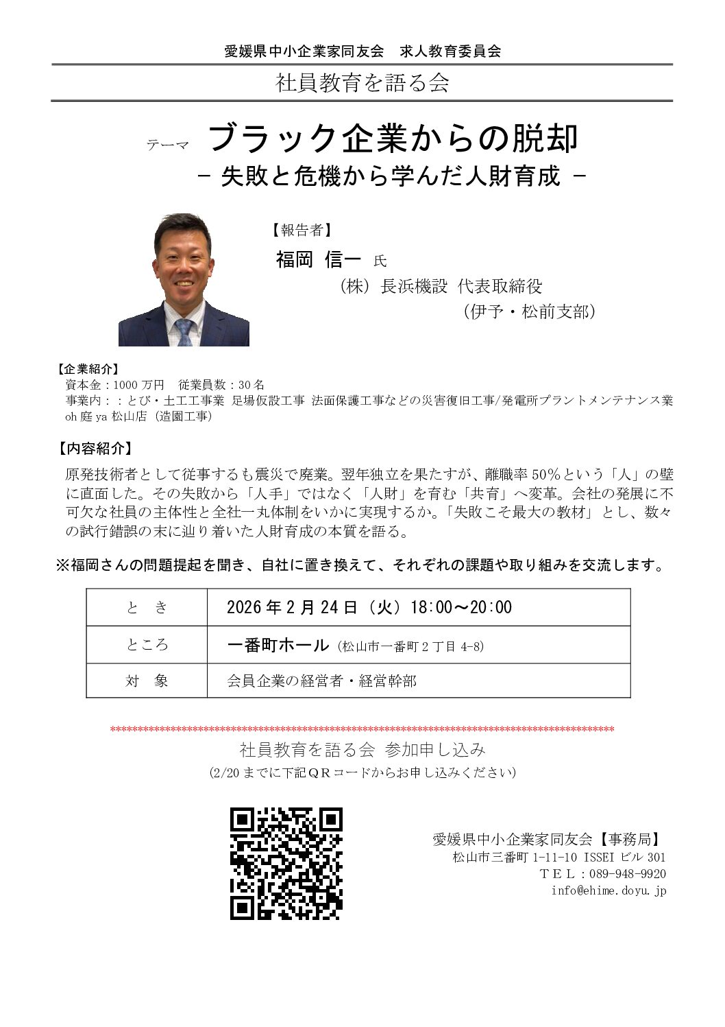 2026年2月24日(火)、松山市の一番町ホールにて、愛媛県中小企業家同友会 求人教育委員会主催の「社員教育を語る会」が開催されました。